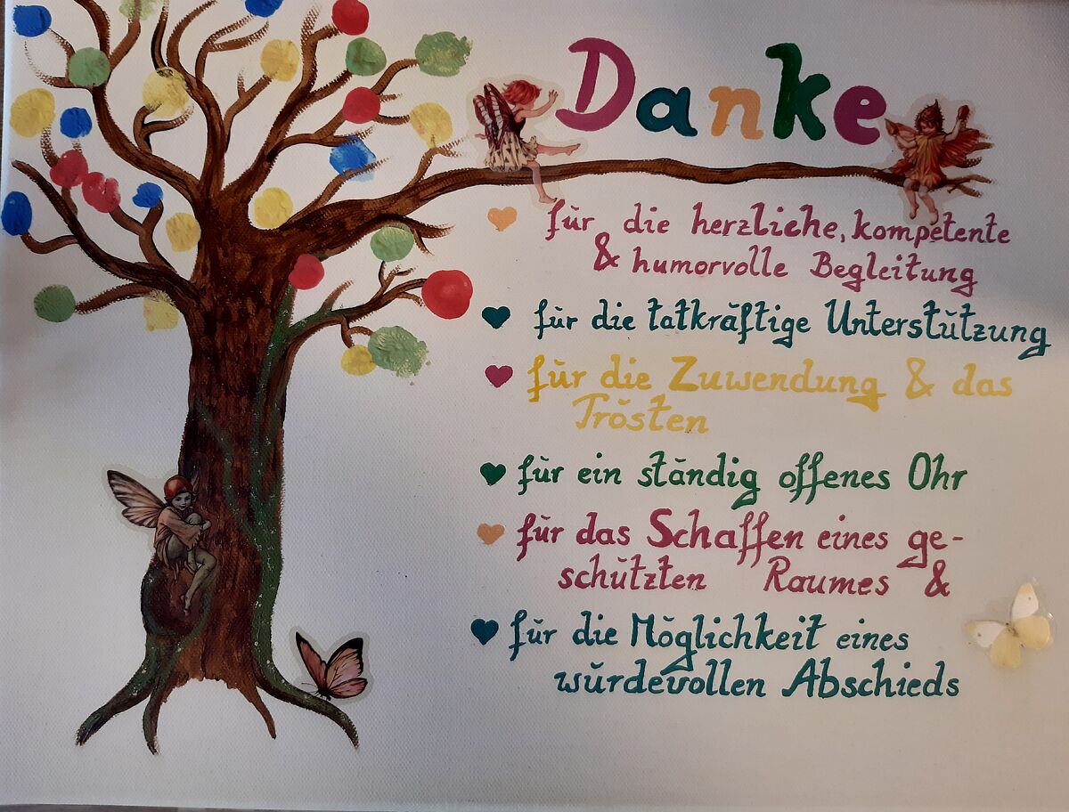 Liebes Hospiz-Team, DANKE, dass meine Tante, die wie eine Mama für mich war in Würde auf ihre letzte Reise gehen konnte. Leider konnte sie nur eine Woche in Eurem Haus verbringen, bevor sie friedlich eingeschlafen ist. DANKE für die kompetente sowie fürsorgliche Betreuung und Pflege. DANKE für die Ruhe in Eurem Haus, die einfühlsame Unterstützung und das nicht allein lassen in den letzten Minuten des Abschiednehmens. DANKE auch im Namen meines Onkels für die Möglichkeit, einige Tage und Nächte ganz hier gewesen sein zu dürfen und dass sich um uns Angehörige ebenfalls aufmerksam gekümmert wurde. DANKE, dass es Menschen und Einrichtungen wie Euch gibt.